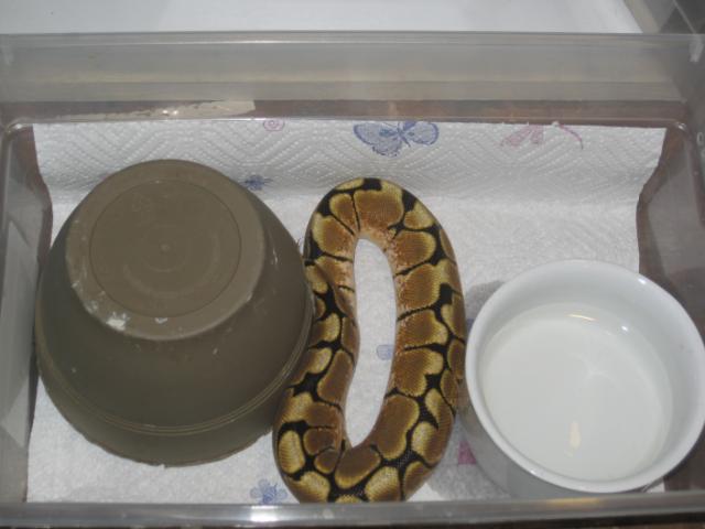 This is how each tub is set up for my babies. The hide is a flower pot I bought for $.15 once winter came along. I soldered an opening for the snake to go through. The water bowl is from a kitchen store and was $2.