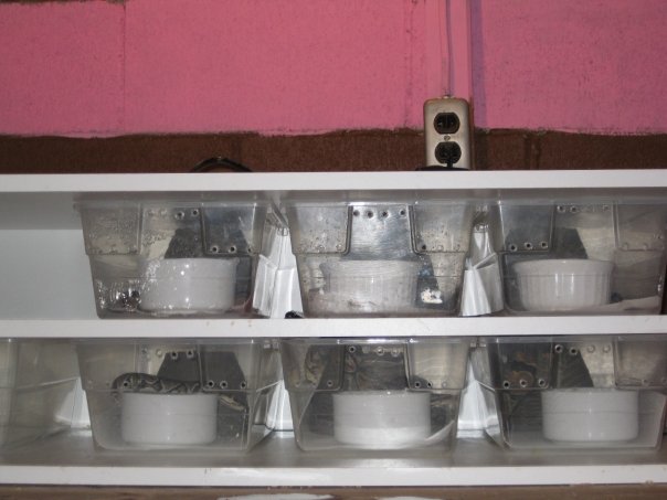 Right after the move, a little messy, but you get the idea. I definitely need some more racks, I don't have any room left! The little black racks are from Reptile Basics, and the breeder rack is homemade for just under $300. I love the Reptile Basic racks, I went with back heat on them. The breeder rack is done with belly heat.Everything is heated with flexwatt, but I also heat the snake room in the winter to keep the ambient temps at 75. I had RI issues with my breeders when the ambient temp was kept at 70.